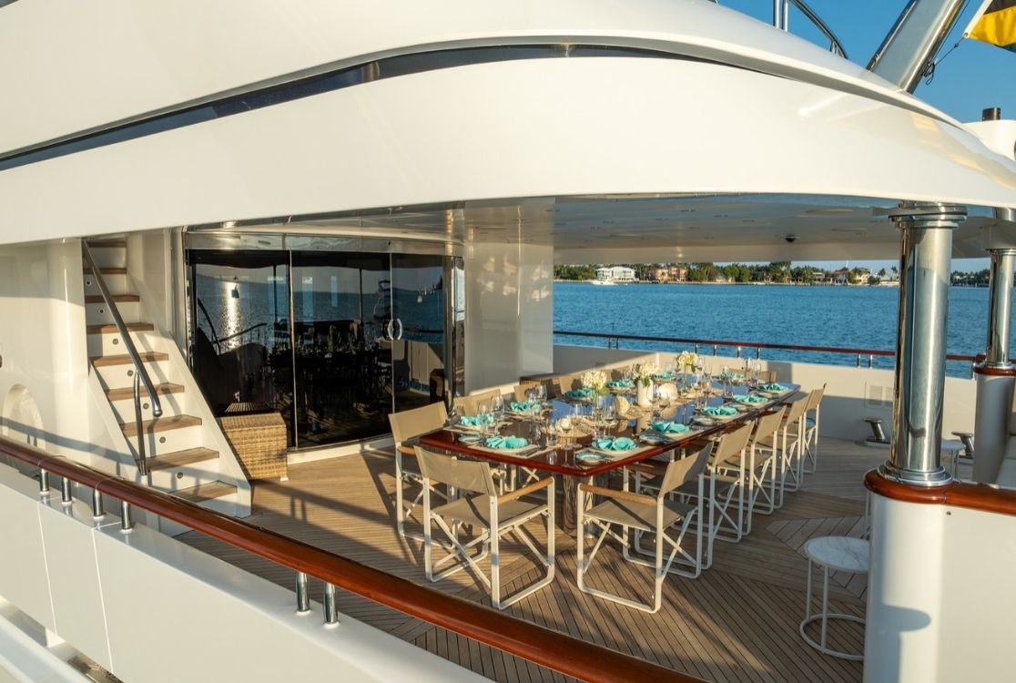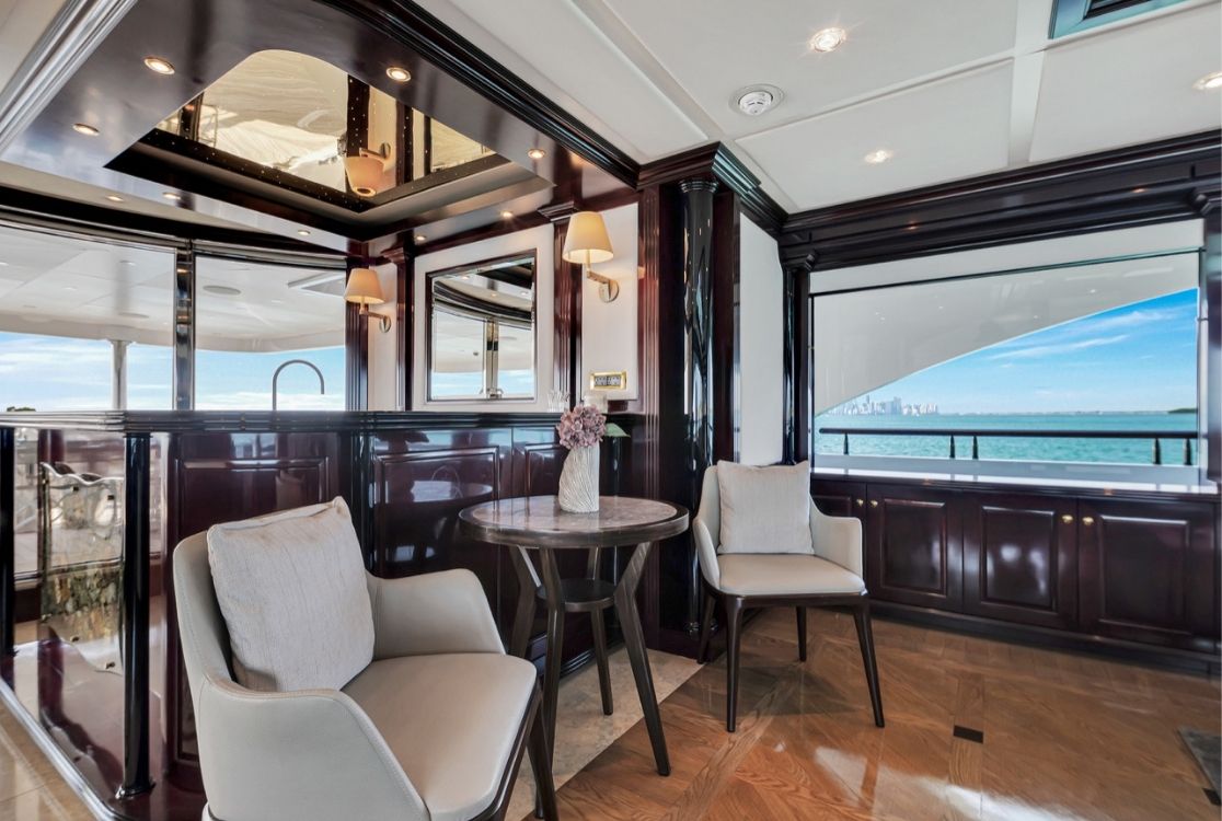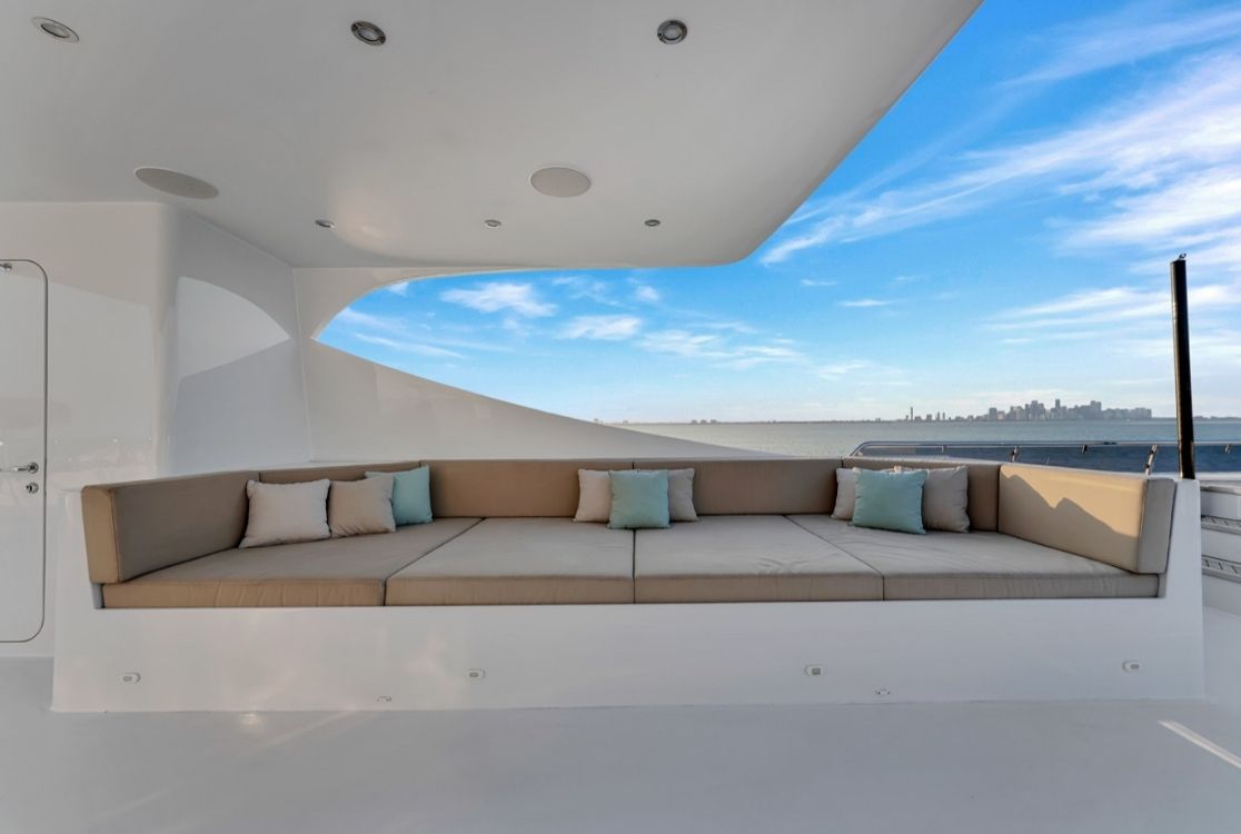Inside, this Mega Yacht rental offers the ambiance of a floating five-star resort. Seven beautifully appointed staterooms accommodate up to 13 overnight guests, ensuring privacy and sophistication. Whether you choose this Miami yacht rental for a high-end corporate event or a private escape, a dedicated crew of seven is on hand to deliver a seamless, world-class service.